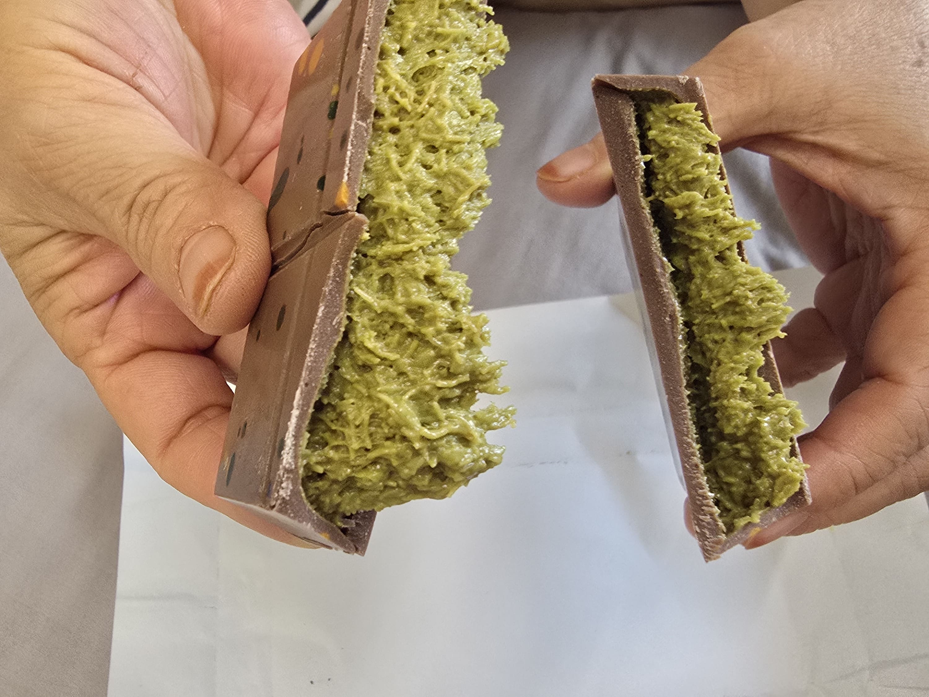 요즘은 ‘피스타치오 쿠나파 초콜릿’ 콘셉트가 유명해지면서 비슷한 제품이 많다. 하지만 대체로 속이 얇거나 당도가 과해서 금방 물리는 경우가 있었다. 반면 픽스는 사진처럼 속의 밀도가 높아, 초콜릿이라기보다 디저트 한 조각을 먹는 느낌이 난다.
